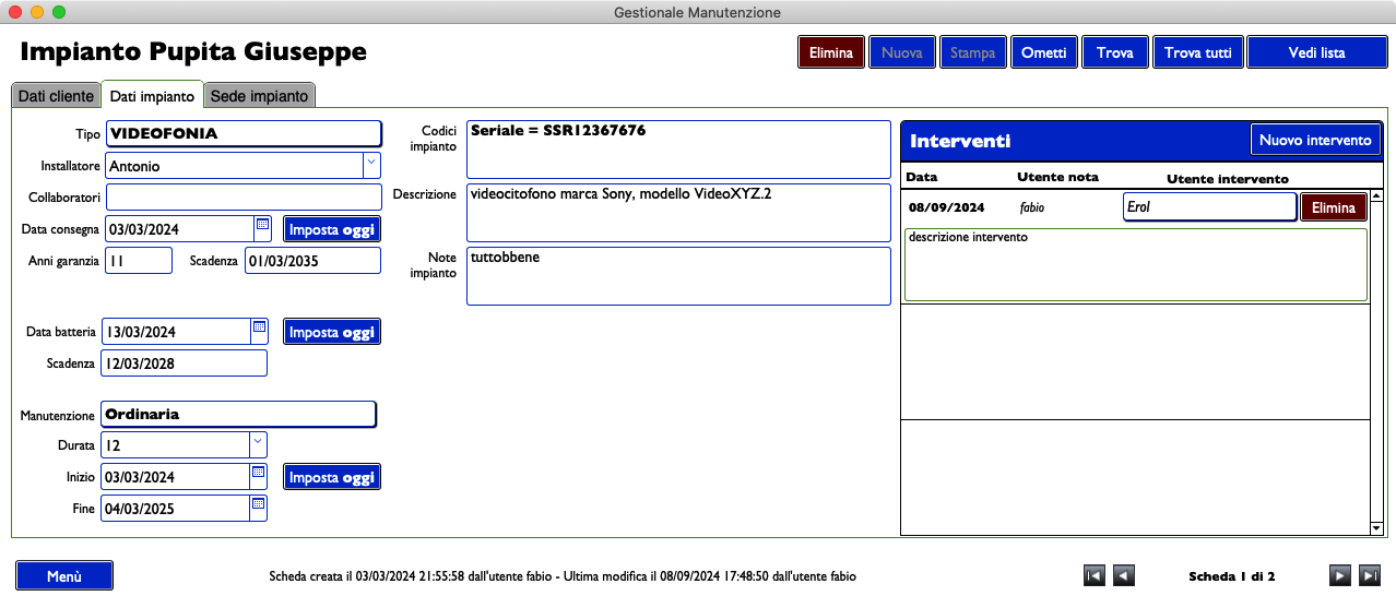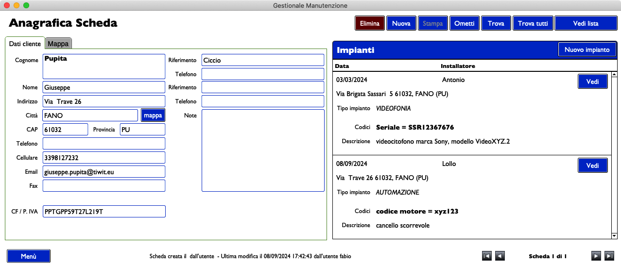 Il gestionale consente di gestire la installazione e manutenzione di impianti di vario tipo; permette con rapidità e semplicità di consultare le informazioni del cliente e dell’impianto